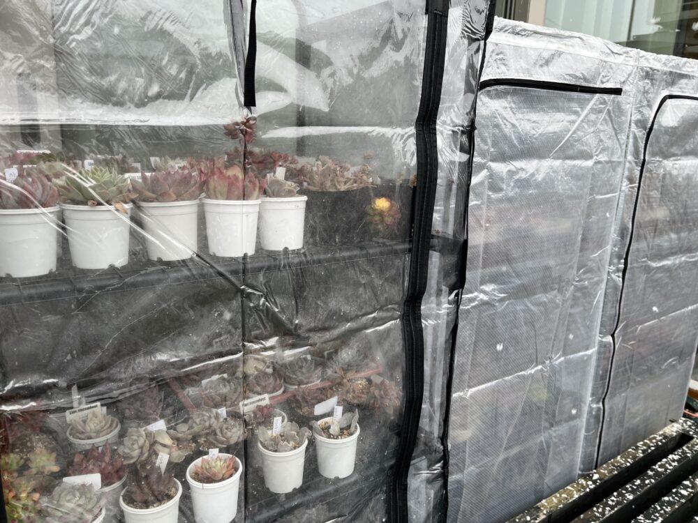 慌ててカバーをかける 2025.12.05 天気予報をちゃんとみてなくて、なんか寒くなるんだね。くらいの認識でいた。例年だと、そろそろ多肉棚にカバー掛けようかなという感じ。朝起きたら雪。多肉に雪が積もってた。慌ててカバーをかけて、バタバタと冬越し準備完了。